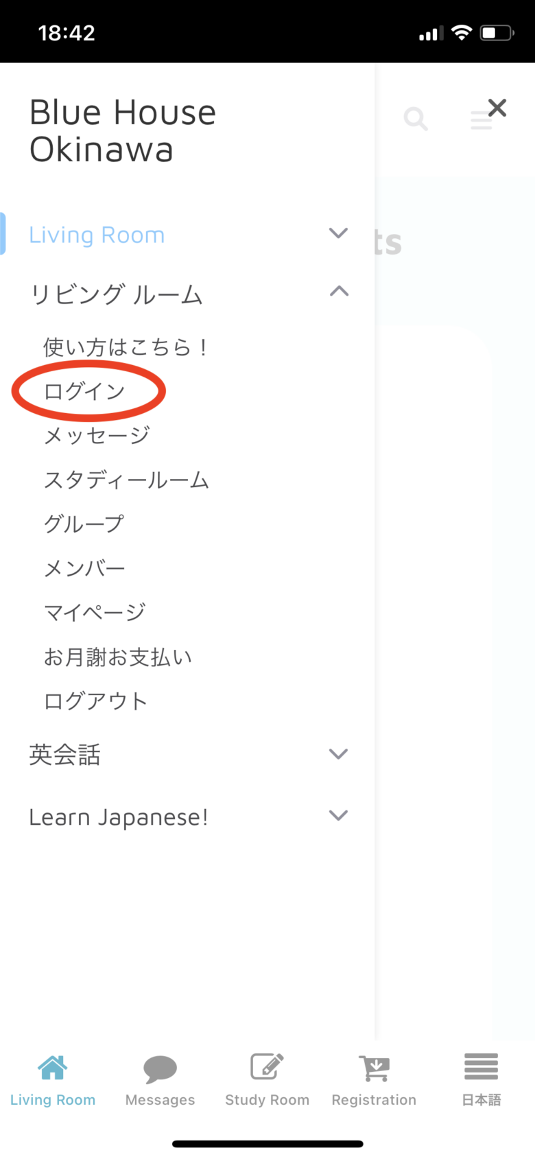 2.「リビングルーム」 > 「ログイン」をクリック。
